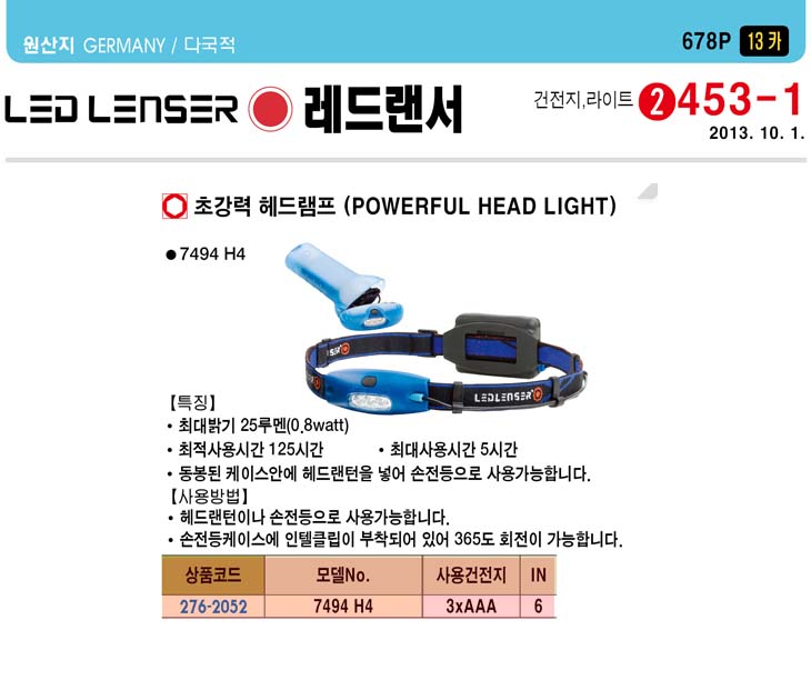 [·¹µå·£¼­] Ãʰ­·Â Çìµå¶óÀÌÆ®(7494 H4, AAAx3°³, 25·ç¸à/0.8Watt)(Powerful Headlight)