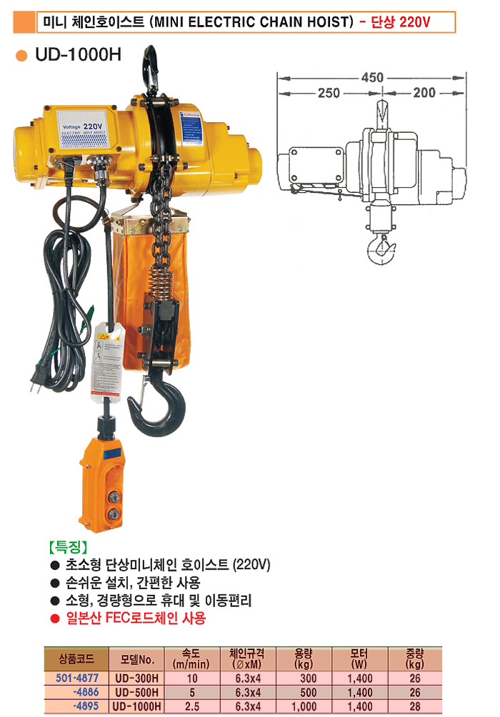 [UDT] UDT KIO ¹Ì´ÏüÀÎÈ£À̽ºÆ®(UD-500H)(¼Óµµ 5M/Min, ºÎÇÏÁß·® 500Kg)(Mini Electric Chain Hoist)=>Á¦Ç°´ÜÁ¾!