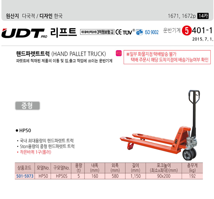 [UDT] ÇÚµå ÆÄ·¿Æ® Æ®·° ÁßÇü(HP50/HP50S, 5.0Ton)(Hand Pallet Truck)