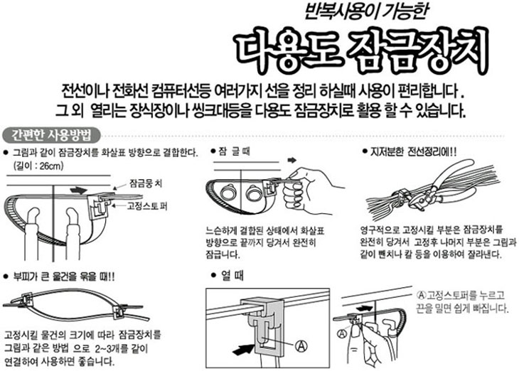 ¾ÓÁê ´Ù¿ëµµ Àá±ÝÀåÄ¡´Â ±âÁ¸¿¡ Àü±â Àü¹®°¡µéÀÌ Àü¼±À» ¹´Âµ¥ ¾²´ø "ÄÉÀ̺í ŸÀÌ(cable tie)"¶ó´Â Á¦Ç°ÀÇ °³¼±ÇüÀÔ´Ï´Ù.