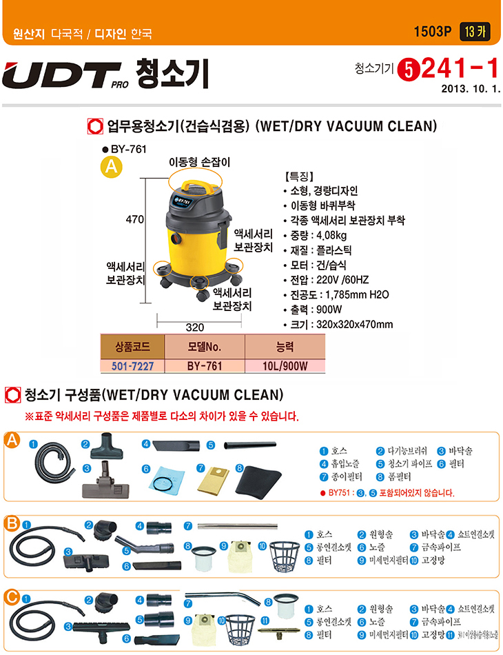[UDT] ¾÷¹«¿ëû¼Ò±â(BY-761, °Ç½Ä/½À½Ä °â¿ë, 10¸®ÅÍ, 900Watt)(WET/DRY VACUUM CLEANER)=>Á¦Ç°´ÜÁ¾!