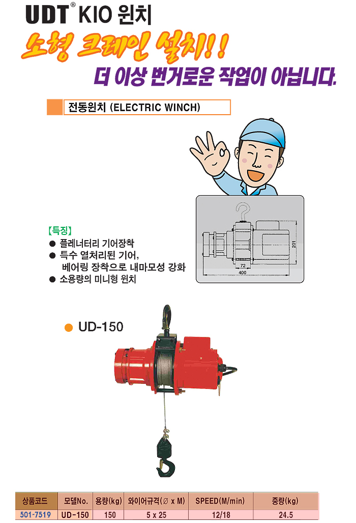 [UDT] UDT KIO Àüµ¿À©Ä¡(UD-150, ¼ÓµµÃÖ´ë 18¹ÌÅÍ/ºÐ, ºÎÇÏÁß·® 150Kg)(Electric Winch)