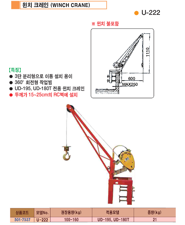 [UDT] UDT KIO À©Ä¡Å©·¹ÀÎ(U-222, ºÎÇÏÁß·® ÃÖ´ë160Kg)(Winch Crane)(UD-195 ȤÀº UD-180TÀüµ¿À©Ä¡¿ë)(À©Ä¡´Â º°¸Å)