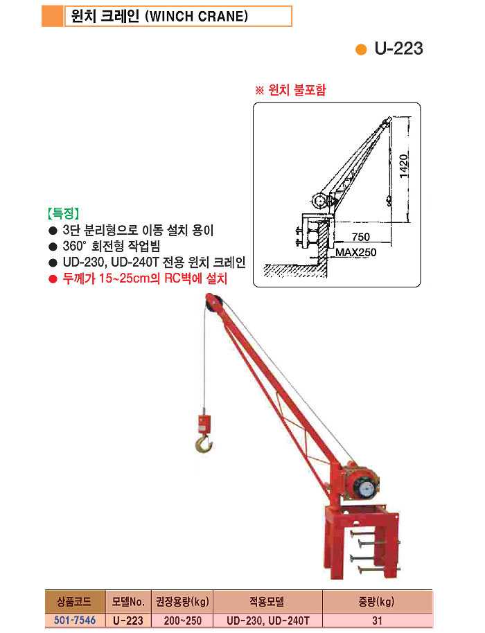 [UDT] UDT KIO À©Ä¡Å©·¹ÀÎ(U-223, ºÎÇÏÁß·® ÃÖ´ë250Kg)(Winch Crane)(UD-230 ȤÀº UD-240TÀüµ¿À©Ä¡¿ë)(À©Ä¡´Â º°¸Å)