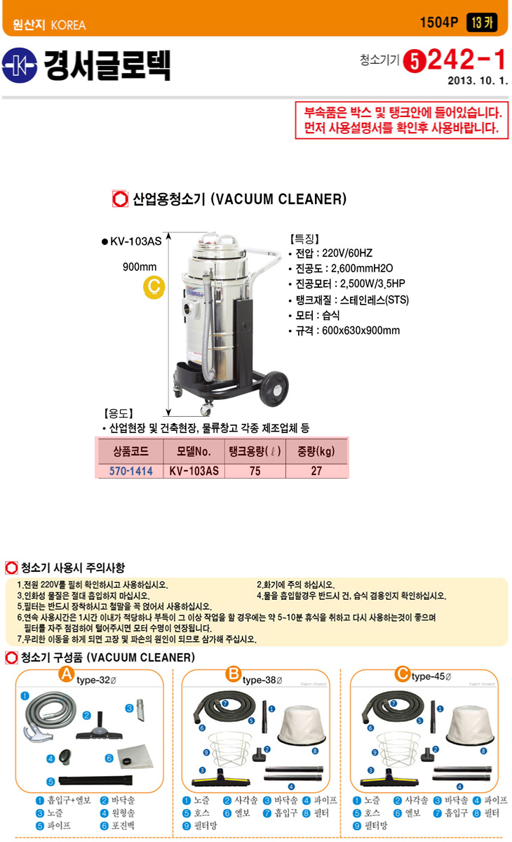 [°æ¼­] »ê¾÷¿ëû¼Ò±â(KV-103B, °Ç½Ä 2700Watt, 75¸®ÅÍ)