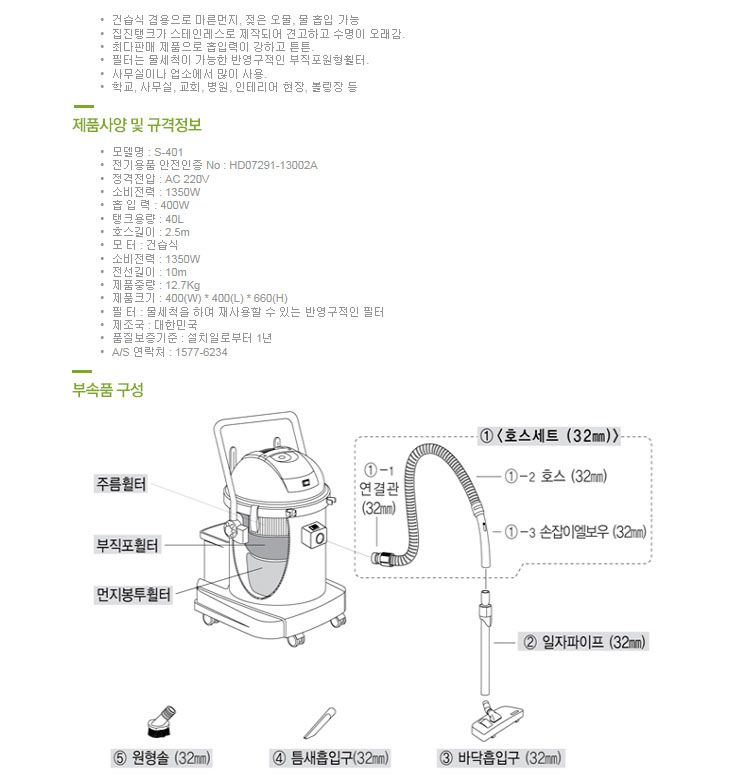 [º¸Èï] ¾÷¹«¿ë/¿µ¾÷¿ë Áø°øÃ»¼Ò±â(S-401, °Ç½Ä/½À½Ä °â¿ë, 40¸®ÅÍ, 1350Watt)(Vacuum Cleaner)