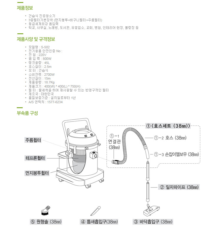 [º¸Èï] ¾÷¹«¿ë/¿µ¾÷¿ë 2¸ðÅÍ Áø°øÃ»¼Ò±â(S-502, °Ç½Ä/½À½Ä °â¿ë, 50¸®ÅÍ, 1350Watt x 2°³)(Vacuum Cleaner)