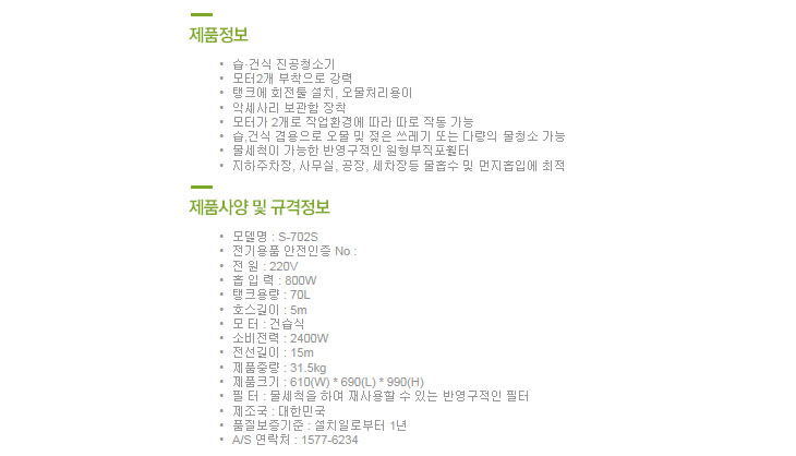 [º¸Èï] ¿µ¾÷¿ë/»ê¾÷¿ë ¿Ã ½ºÅÙ·¹½º 2¸ðÅÍ Áø°øÃ»¼Ò±â(S-702S, °Ç½Ä/½À½Ä °â¿ë, 70¸®ÅÍ, 1350Watt x 2°³)(Vacuum Cleaner)