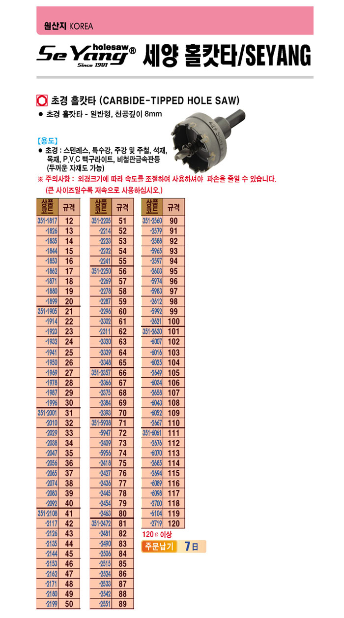 [¼¼¾ç]Ãʰæ ȦıŸ(Carbide Tipped Hole saw)(38©ª, õ°ø±íÀÌ 8mm)(½ºÅÙ, Ư¼ö°­, ÁÖ°­, ÁÖö, ¼®Àç, ¸ñÀç, PVC»ª±¸¶óÀÌÆ®, ºñö±Ý¼Óµî)