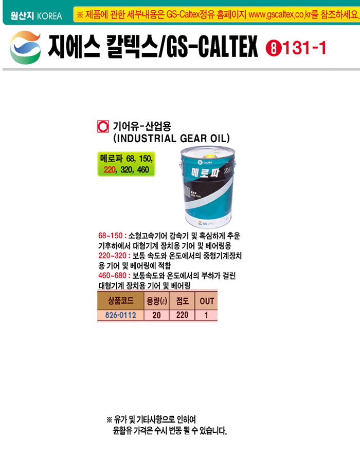 [GSĮŨ½º]»ê¾÷¿ë±â¾îÀ¯(¸Þ·ÎÆÄ 20¸®ÅÍ, Á¡µµ:320)(Industrial Gear Oil):5/2 ÇöÀç ÀϽÃǰÀý!!