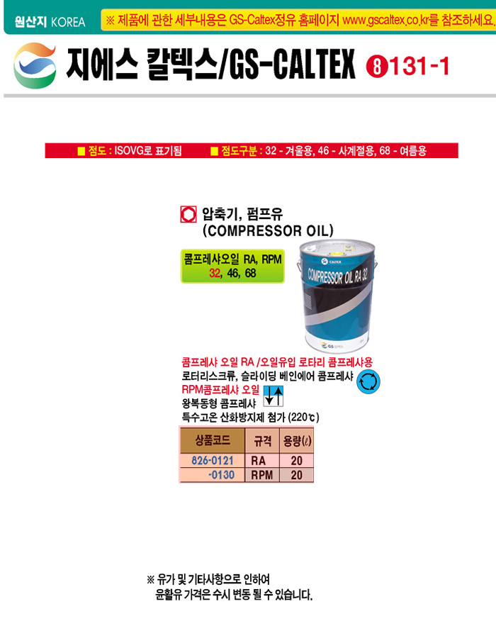 [GSĮŨ½º]¾ÐÃà±â ÆßÇÁÀ¯(RPM, 20¸®ÅÍ, Á¡µµ:32, EP VDL)(Compressor Oil)