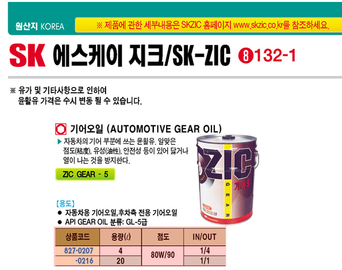 [SK]ÀÚµ¿Â÷¿ë ±â¾î¿ÀÀÏ(ZIC G-5, 80W/90, 4¸®ÅÍ)(Automotive Gear Oil):12/12 ÇöÀç ÀϽÃǰÀý!!