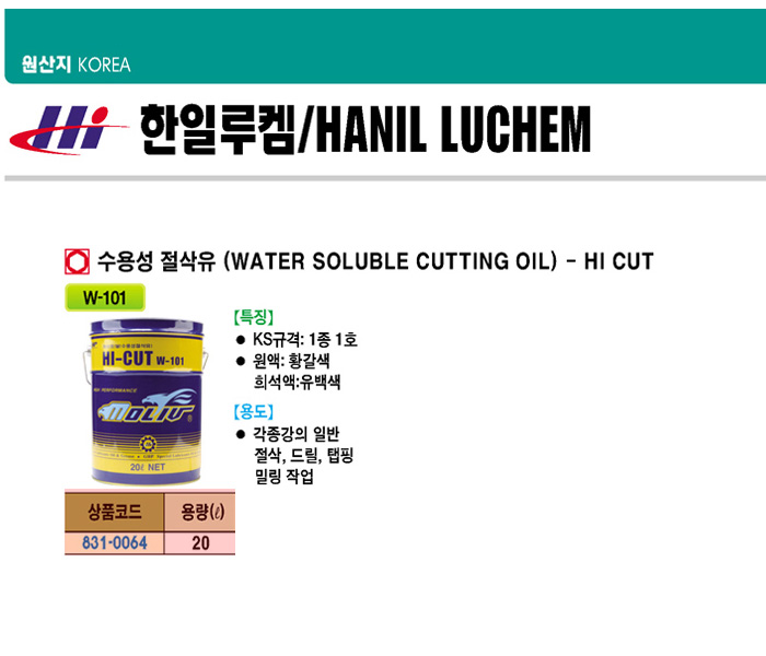 [ÇÑÀÏ]¼ö¿ë¼º Àý»èÀ¯(20¸®ÅÍ, W-101)(Water Soluble Cutting Oil) - Hi Cut