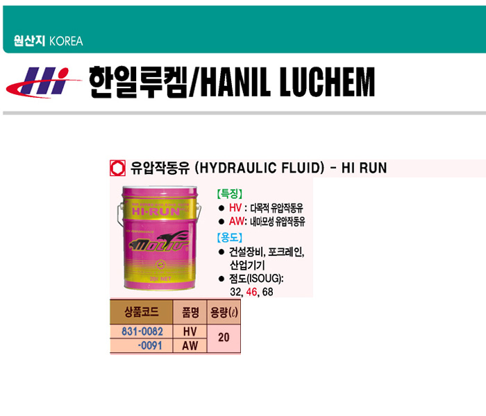 [ÇÑÀÏ]À¯¾ÐÀÛµ¿À¯(20¸®ÅÍ, Á¡µµ:46, AW:³»¸¶¸ð¼ºÀ¯¾ÐÀÛµ¿À¯)(Hydraulic Fluid)- Hi Run(Àç°íÀ¯¹«È®Àοä¸Á)