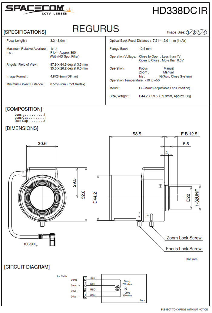 [SPACECOM]IRÁ¶¸í¿ë·»Áî/Àû¿Ü¼±Á¶¸í·»Áî HDHD338DCIR 3.3-8mm 1/3" 1.3Mega Pixels Day and Night Lens(°ßÀû¿äû)
