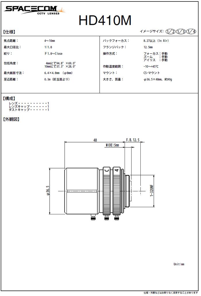 [SPACECOM]Mega Pixels Varifocal Lens HD410M Manual IRIS 1/2"(°ßÀû¿äû)