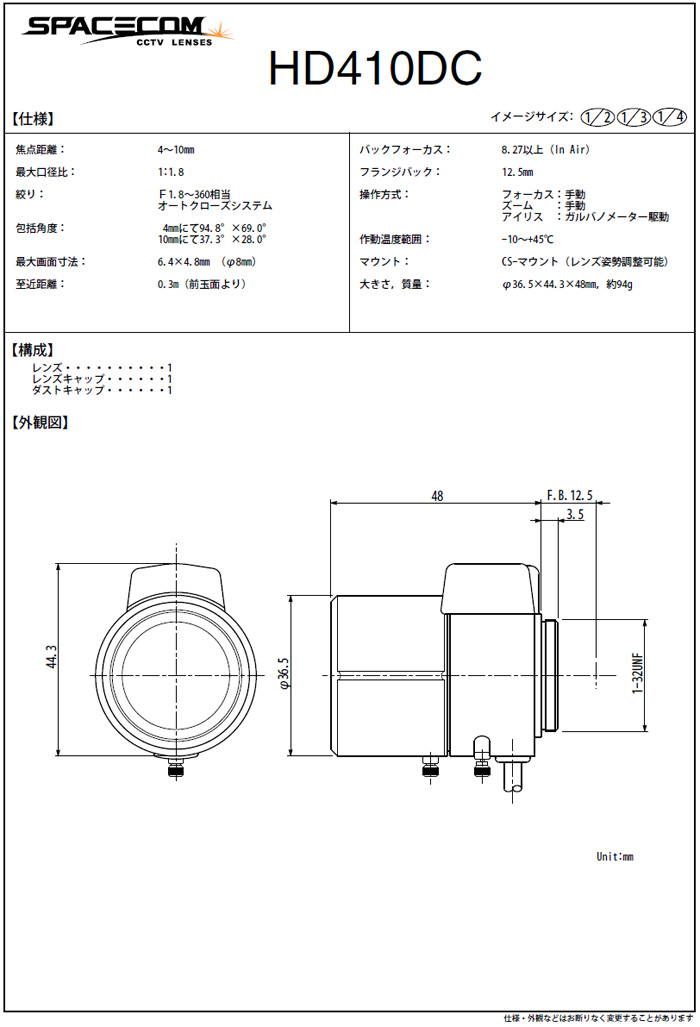 [SPACECOM]Mega Pixels Varifocal Lens HD410DC 4-10mm DC IRIS 1/2" Varifocal Lens(°ßÀû¿äû)