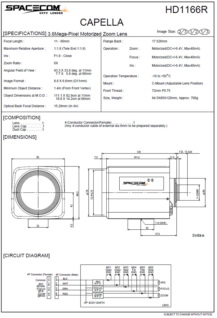 [SPACECOM]Motorized Zoom Lenses HD1166R 6¹èÁÜ(11-66mm) 2/3" 3.6Mega Pixels(°ßÀû¿äû)