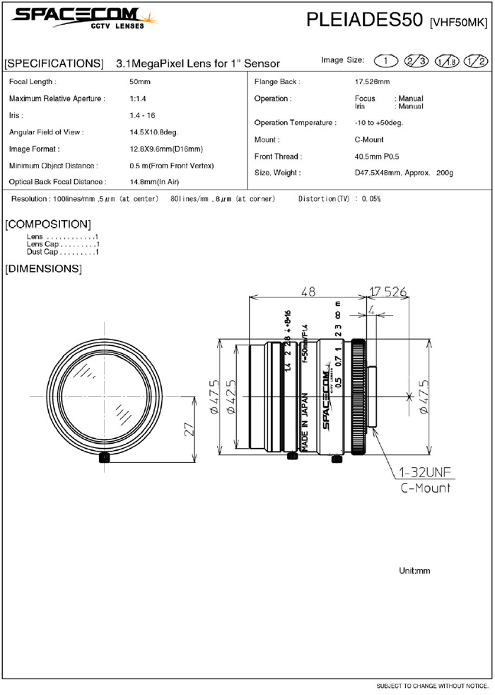 [SPACECOM]3.1Mega Pixel Lens VHF50MK 50mm 1"(°ßÀû¿äû)