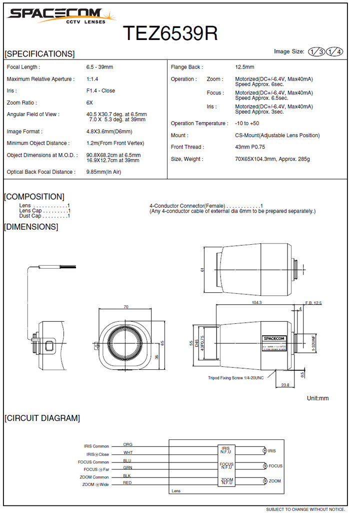 [SPACECOM]Motorized Zoom Lens TEZ6539R 6¹èÁÜ (6.5-39mm) 1/3" 3Motor (°ßÀû¿äû)