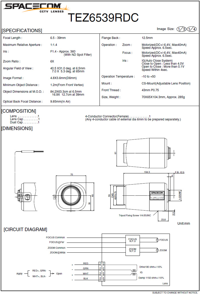 [SPACECOM]Motorized Zoom Lens TEZ6539RDC 6¹èÁÜ (6.5-39mm) 1/3" DC IRIS (°ßÀû¿äû)