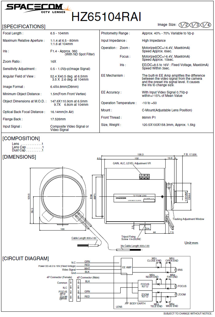 [SPACECOM]Motorized Zoom Lens HZ65104RAI 16¹èÁÜ (6.5-104mm) 1/2" Video IRIS (°ßÀû¿äû)