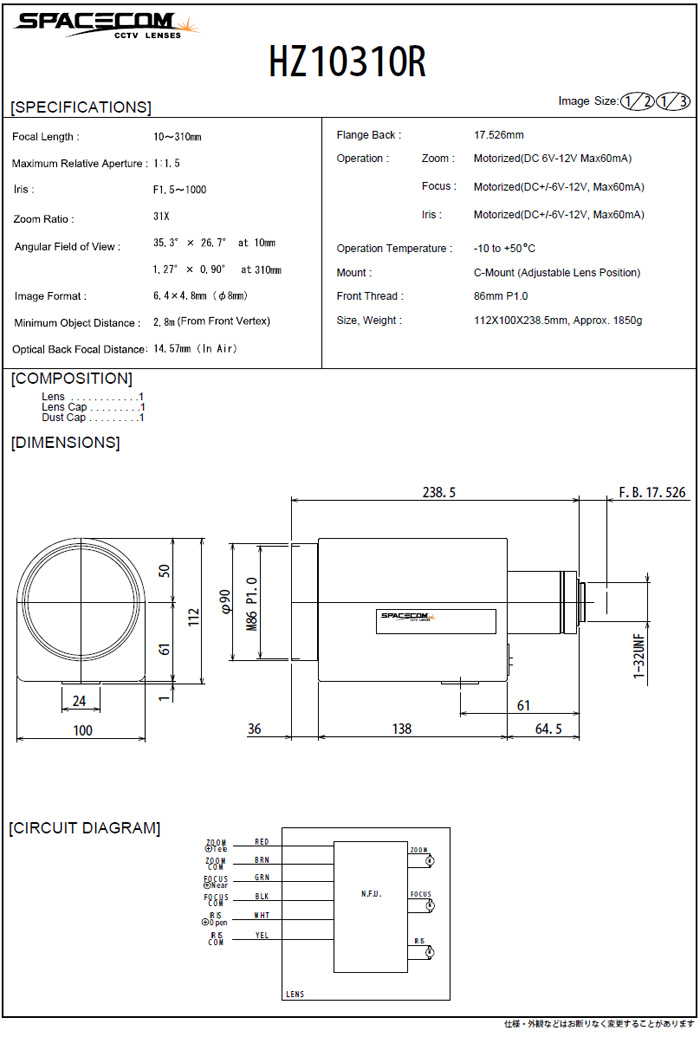 [SPACECOM]Motorized Zoom Lens HZ10310R 31¹èÁÜ (10-310mm) 1/2" 3Motor(°ßÀû¿äû)