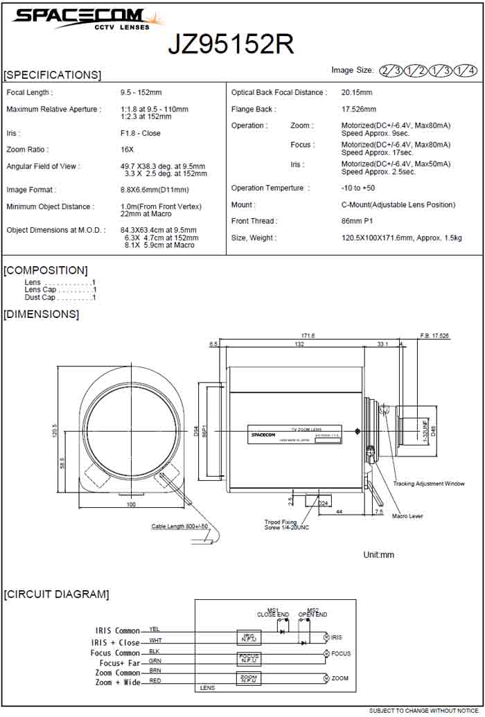 [SPACECOM]Motorized Zoom Lens JZ95152R 16¹èÁÜ (9.5-152mm) 2/3" 3Motor(°ßÀû¿äû)