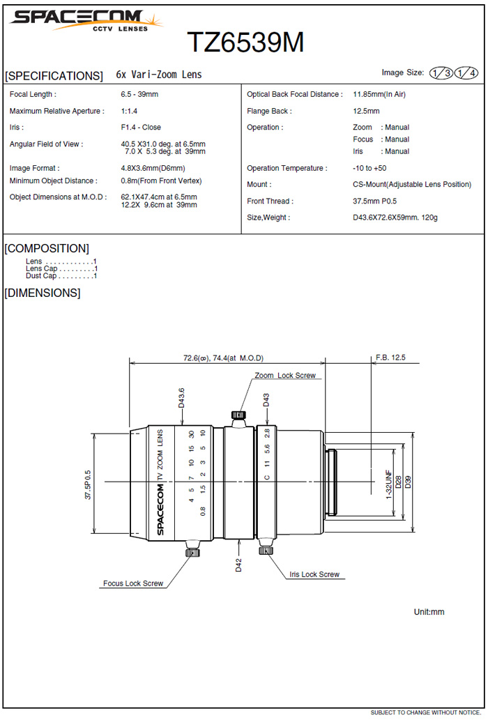 [SPACECOM]Manual Zoom Lens TZ6539M 6¹èÁÜ (6.5-39mm) 1/3ÀÎÄ¡ Manual IRIS (°ßÀû¿äû)