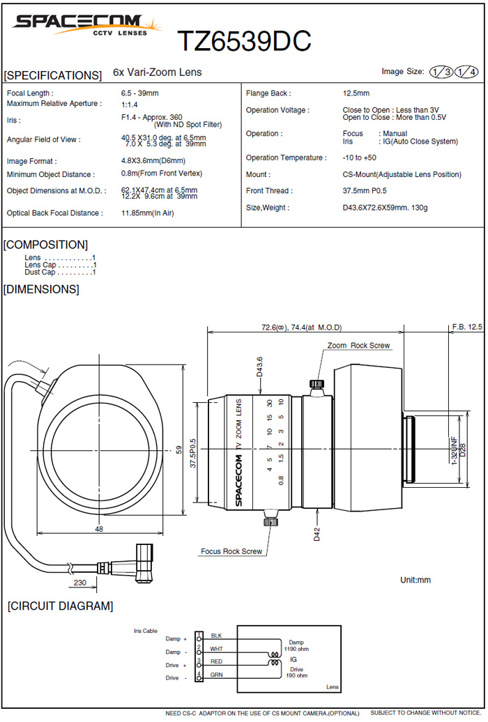 [SPACECOM]Manual Zoom Lens TZ6539M 6¹èÁÜ (6.5-39mm) 1/3ÀÎÄ¡ DC IRIS (°ßÀû¿äû)=>Á¦Ç°´ÜÁ¾=>¸ðµ¨º¯°æ(TEZ6565RDC)ÇÏ¿© ÃâÇÏ!