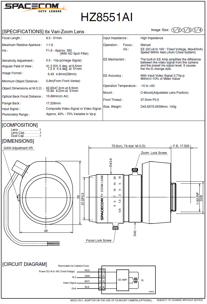 [SPACECOM]Manual Zoom Lens HZ8551M 6¹èÁÜ (8.5-51mm) 1/2ÀÎÄ¡ Video IRIS (°ßÀû¿äû)