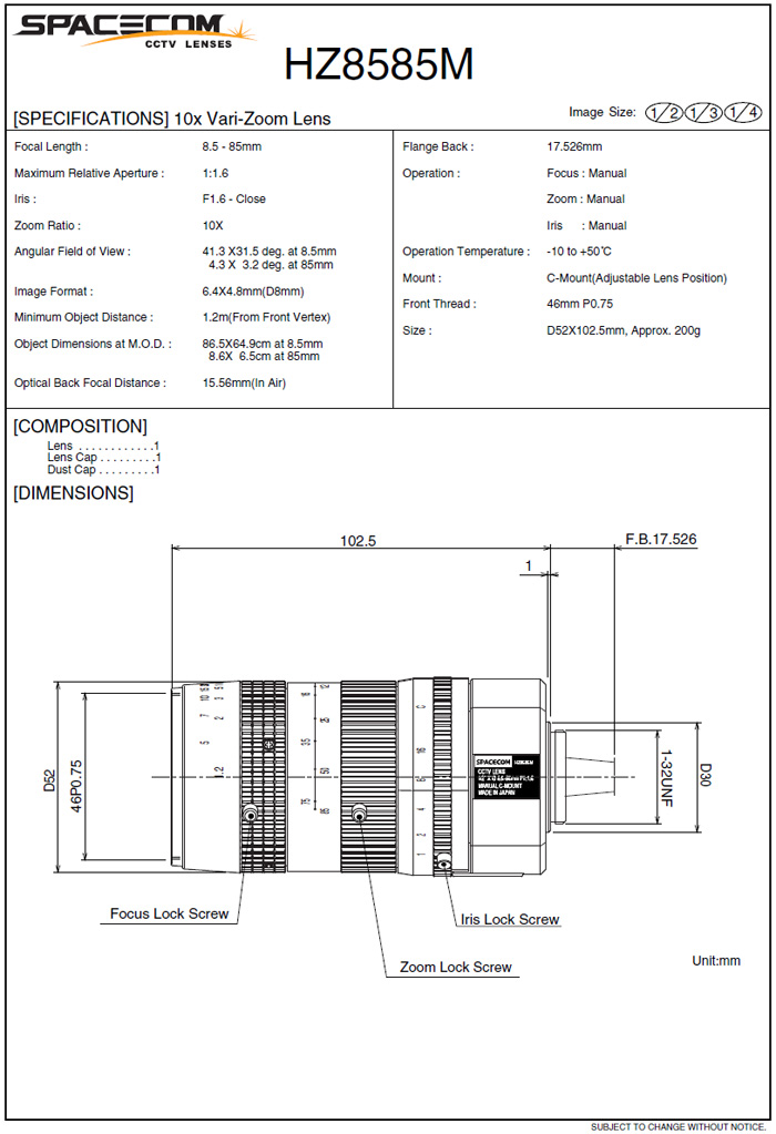 [SPACECOM]Manual Zoom Lens HZ8585M 10¹èÁÜ (8.5-85mm) 1/2ÀÎÄ¡ Manual IRIS=>Á¦Ç°´ÜÁ¾!