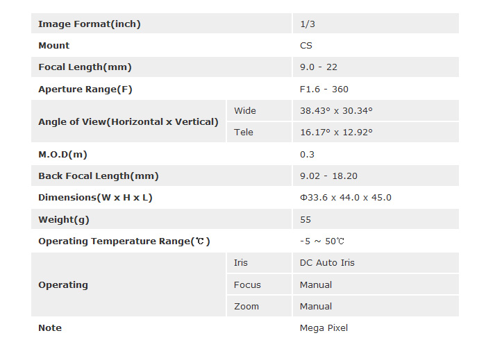 [TOKINA]Mega Pixel Lens TVR0916HDDC (9-22mm) 1/3ÀÎÄ¡ DC IRIS(°ßÀû¿äû)
