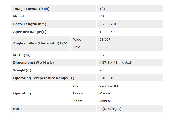 [TOKINA]Day and Night IR Zoom Lens TVR2713DCIR(2.7-12mm) 1/3ÀÎÄ¡ DC IRIS(°ßÀû¿äû)