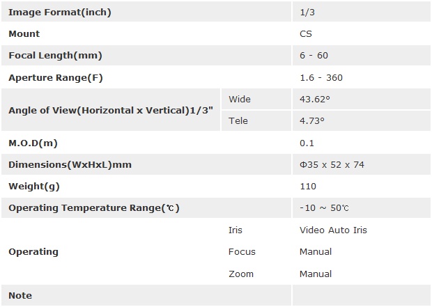 [TOKINA]Vari-Focal Lenses TVR0616AI(6 - 60mm) 1/3ÀÎÄ¡ (°ßÀû¿äû)