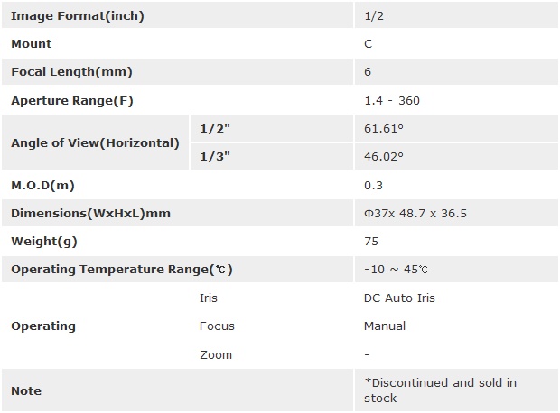 [TOKINA]Mono-Focal(fixed) Lenses TC0614DC(6mm) 1/2ÀÎÄ¡ (°ßÀû¿äû)