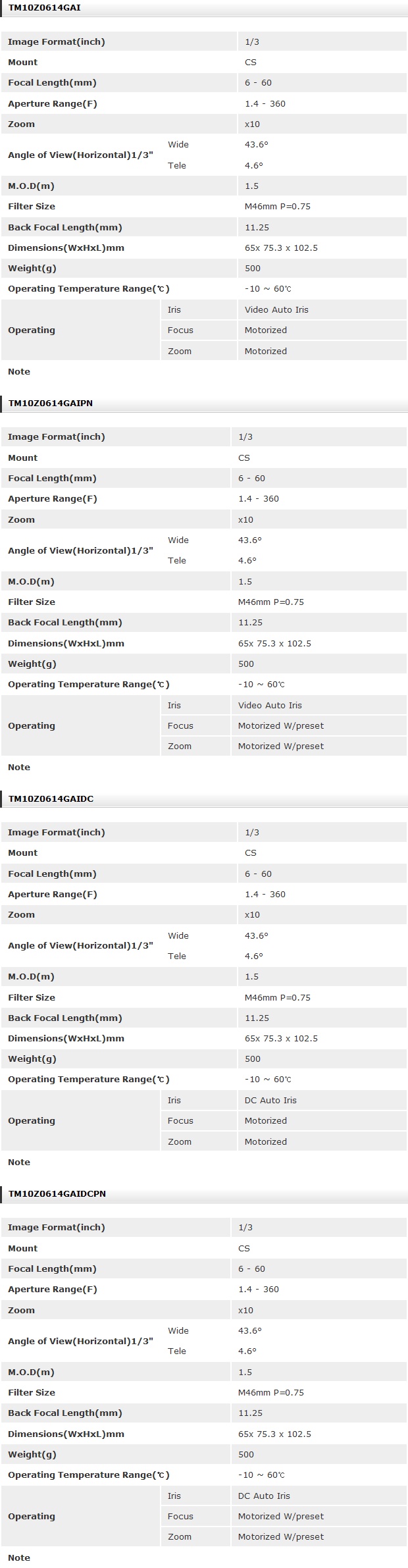 [TOKINA]Standard Motorized Zoom Lenses TM10Z0614GAI(6 - 60mm) 1/3ÀÎÄ¡ (°ßÀû¿äû)
