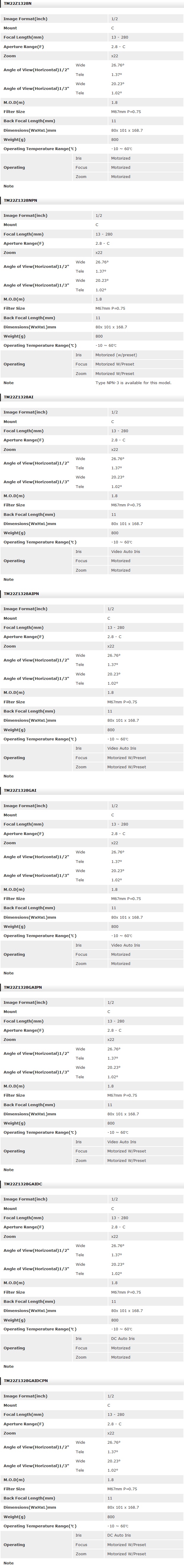 [TOKINA]Standard Motorized Zoom Lenses TM22Z1328N(13 - 280mm) 1/2ÀÎÄ¡ (°ßÀû¿äû)