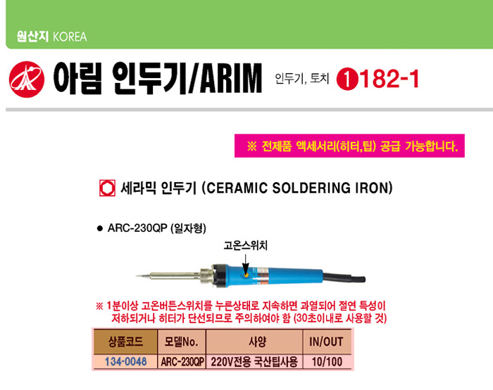 [ARIM]ÀÏÀÚÇü ¼¼¶ó¹ÍÀεαâ(ARC-230QP, 220V, ±¹»êÆÁ)(Ceramic Soldering Iron)