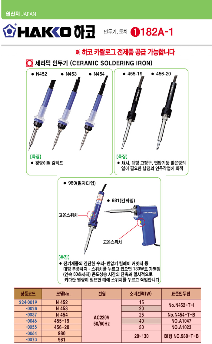[HAKKO]¼¼¶ó¹ÍÀεαâ(981, 220V, 20-130Watt, °ÇŸÀÔ, BIÇü NO.980-T-BÆÁ)(Ceramic Soldering Iron)(½ºÆ½Àεαâ)