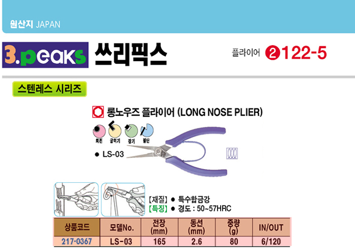 [3peaks] ½ºÅÙ·¹½º ·Õ³ë¿ìÁîÇöóÀ̾î(LS-03, 165mm)(Long Nose Plier)