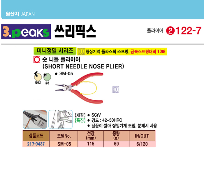 [3peaks] ¹Ì´ÏÁ¤¹Ð ¼ô´Ïµé ÇöóÀ̾î(SM-05,115mm)(Short Needle Nose Plier)