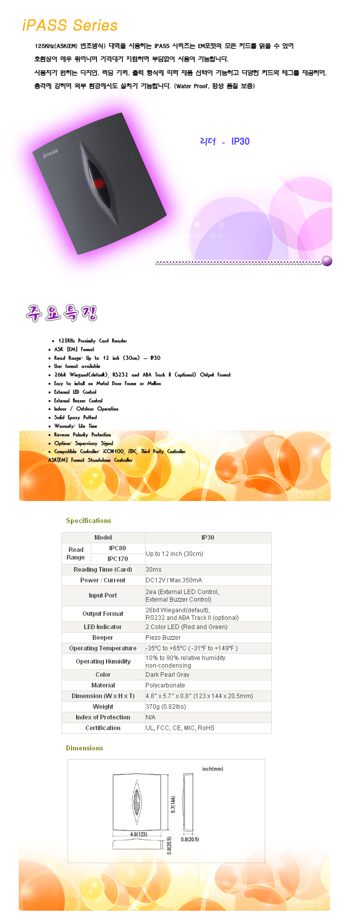 [ID] IP-30(EM 125KHz, 30Cm)(±ÙÁ¢½Ä¸®´õ±â)(Proximity Card Reader)