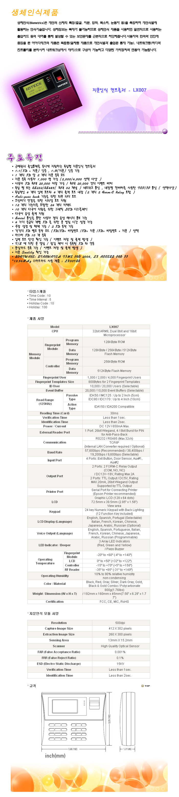 * Ç¥½Ã±Ý¾×Àº ±ÇÀå ¼ÒºñÀÚ °¡°ÝÀ¸·Î 2°³ÀÌ»óÀÇ °æ¿ì °ßÀûÀ» ¿äûÇϽøé ÃÖÀûÀÇ °ßÀû±Ý¾×À» Á¦½ÃÇÕ´Ï´Ù. * ¼¿ï/ºÎ»ê/Æ÷Ç×/°æ³²(â¿ø, ¸¶»ê, ÁøÇØ, ÁøÁÖ)/Àü³²(¼øÃµ, ±¤¾ç) Áö¿ªÀº ¼³Ä¡¸¦ Áö¿øÇÕ´Ï´Ù. -. 125KHZ RF Reader(26Bit Wiegand Output) + Áö¹®ÀÎ½Ä + ºñ¹Ð¹øÈ£ + À½¼ºÁö¿ø -. ÇÑ±Û ±×·¡ÇÈÁö¿ø(24Keypad, LCDÆ÷ÇÔ) -. Åë½Å¹æ½Ä : RS-232C / RS-485 -. Auto Sensor ³»Àå(1:N Identification) -. Áö¿ø ¼ÒÇÁÆ®¿þ¾î : Time Pro 2006 ȤÀº LX Access Pro II ¼±Åð¡´É(º°¸Åǰ) -. ÄÉÀ̽º »ö»óÀº ÁöÁ¤ÇÒ ¼ö ¾ø½À´Ï´Ù.(Àç°í»óȲ¿¡ µû¶ó ÃâÇϵ˴ϴÙ.) |
