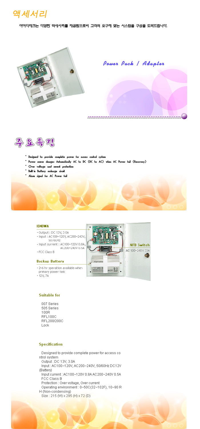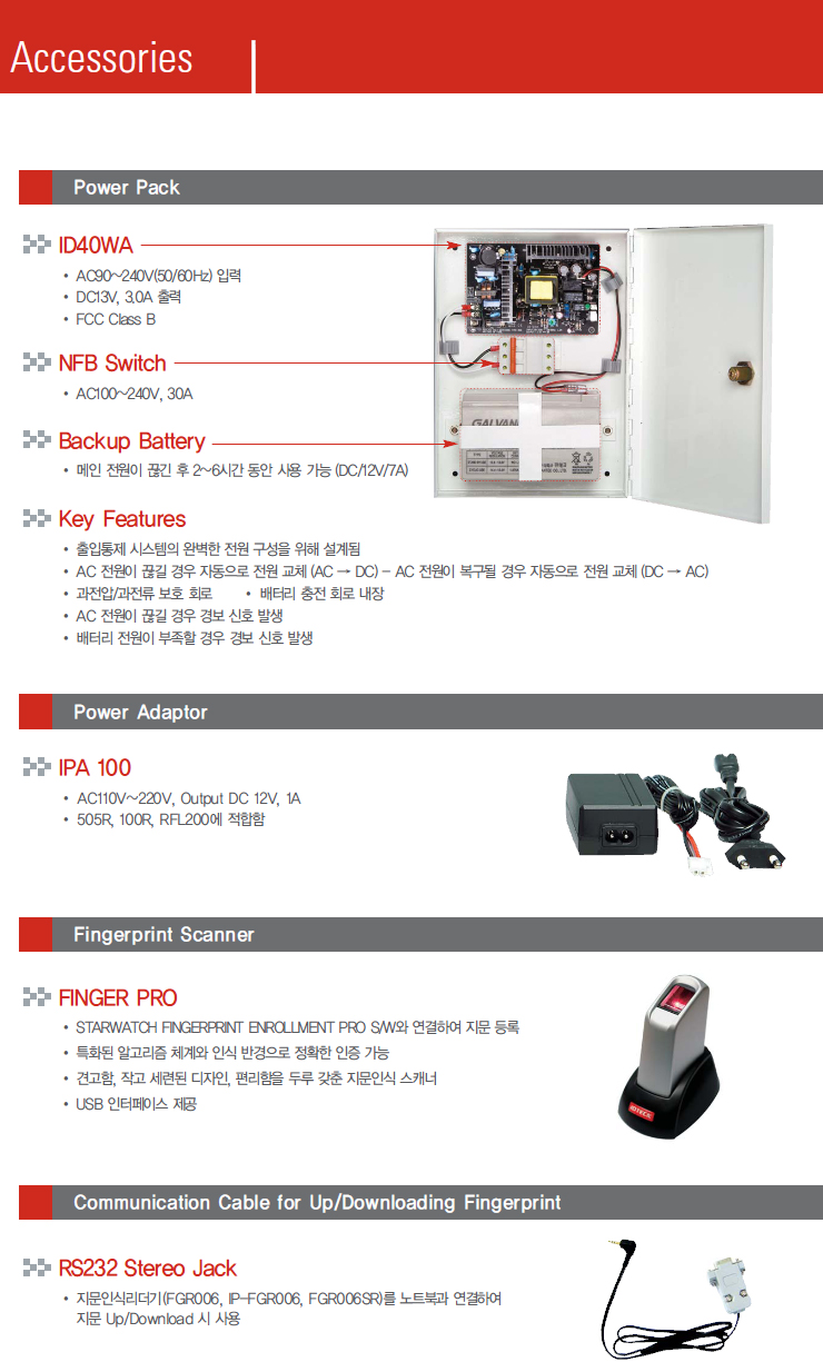 * 100R, 505R, Finger007¿ë * 13VDC Power Board + Backup Battery(7AH)+ CASE + NFB * ACÀü¿ø Fail ¹× Low Battery ¾Ë¶÷°æº¸, Over Voltage and Current Protection