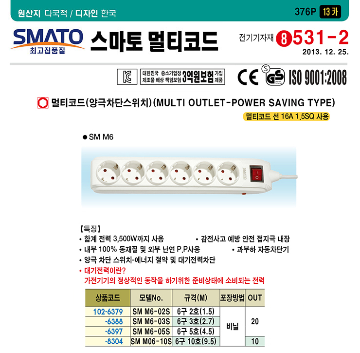 [½º¸¶Åä] ¸ÖƼÅÇ/¸ÖƼÄÚµå/¸ÖƼÄܼ¾Æ® ¾ç±ØÂ÷´Ü½ºÀ§Ä¡ 6±¸(Multi Outlet-Power Saving Type)