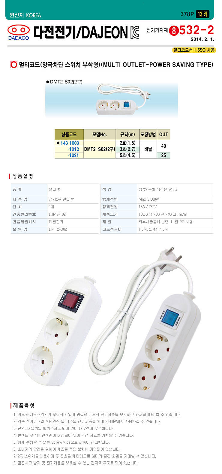 [´ÙÀüÀü±â]¸ÖƼÅÇ/¸ÖƼÄÚµå/¸ÖƼÄܼ¾Æ®(DMT2-S02, 2±¸)(Multi Outlet-Power Saving Type)-¾ç±ØÂ÷´Ü½ºÀ§Ä¡ ºÎÂøÇü