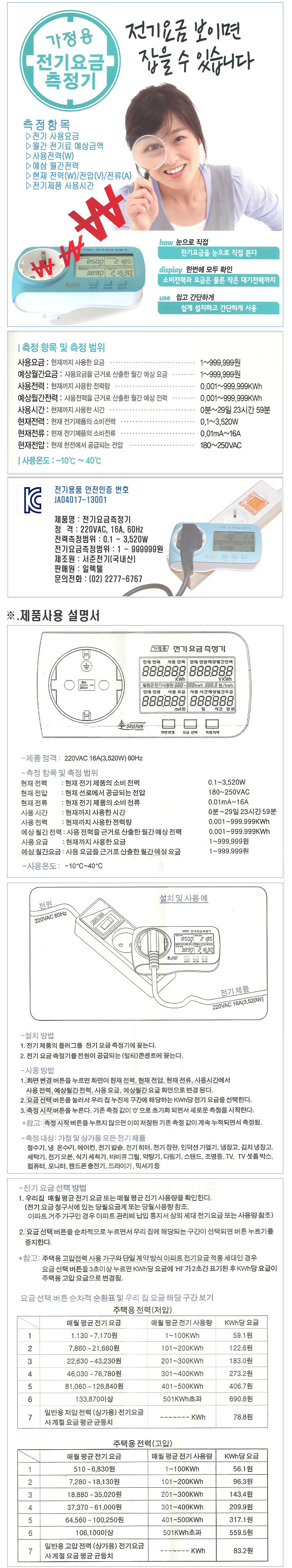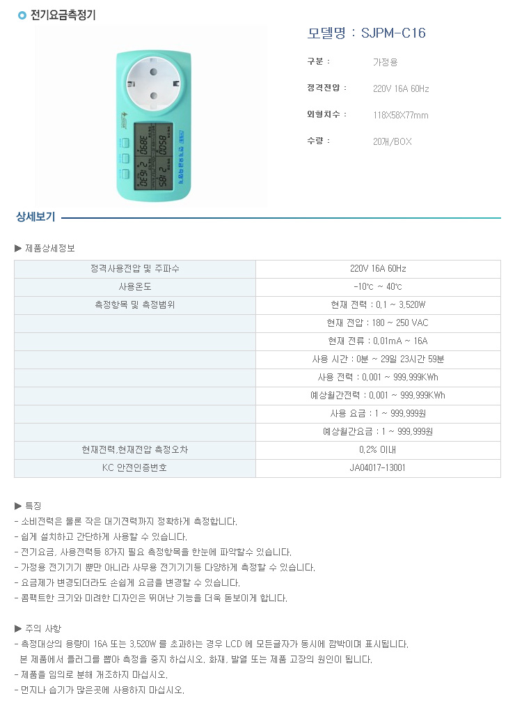 [¼­ÁØ]Äܼ¾Æ®Çü Àü±â¿ä±ÝÃøÁ¤±â(SJPM-C16, °¡Á¤¿ë Àü±â¿ä±ÝÃøÁ¤±â)(Digital Power Meter)