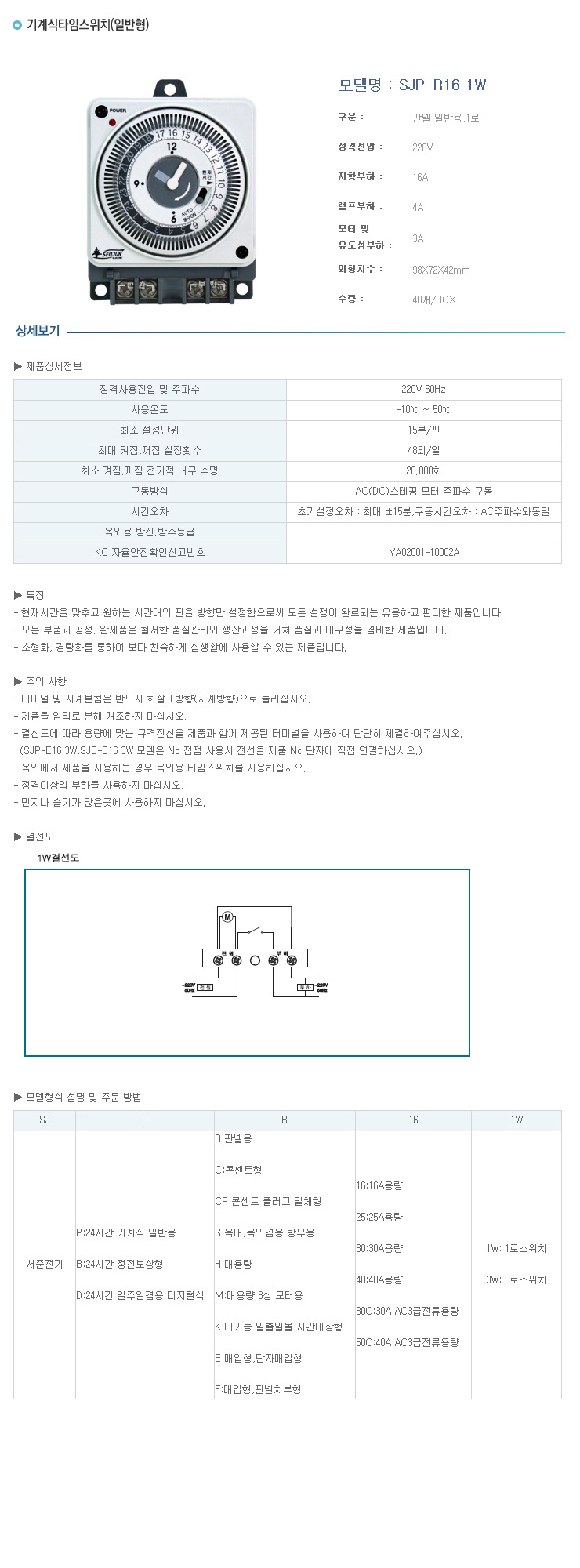 [¼­ÁØ]ÆÇ³Ú¿ë ÀϹÝÇü ±â°è½Ä ŸÀÓ½ºÀ§Ä¡(SJP-R16 1W, 1Kw¹Ì¸¸ºÎÇÏ, 1·Î½ºÀ§Ä¡)(Mechanical Time Switch)