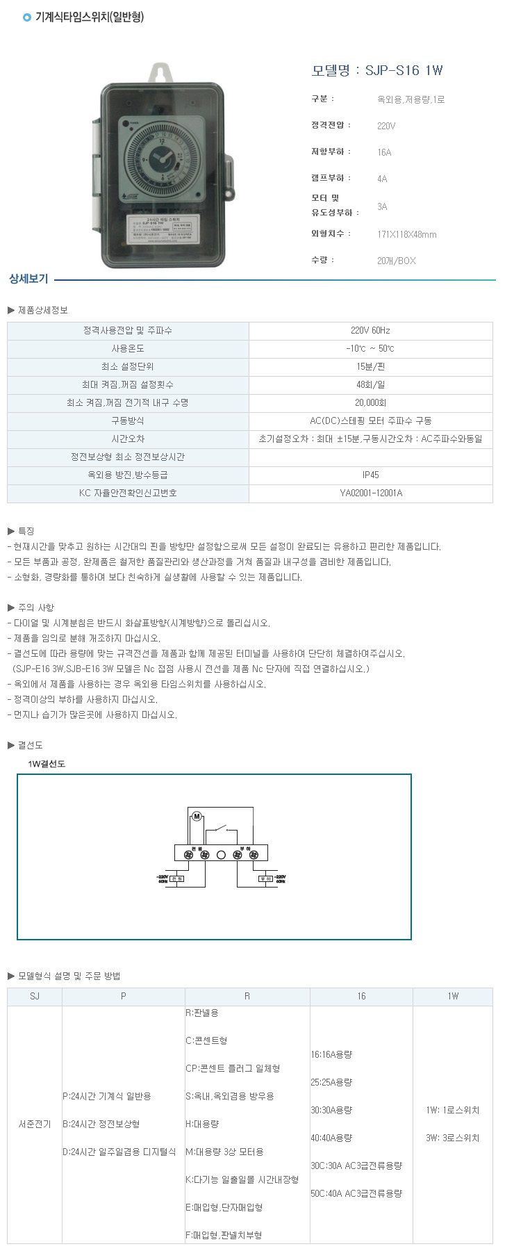 [¼­ÁØ]¿Á¿Ü¹æ¼ö¿ë ÀϹÝÇü ŸÀÓ½ºÀ§Ä¡(SJP-S16 1W, 1Kw¹Ì¸¸ºÎÇÏ, ±â°è½Ä 1·Î ŸÀÓ½ºÀ§Ä¡)(Mechanical Time Switch)
